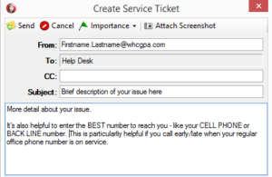 Our normal Help Desk phone support hours are 8:30am-5pm, M-F. If you call with an issue outside of these hours you will reach the “after hours” system and will be able to leave one of two types of messages (normal or emergency priority). If possible, try to create a Service Ticket from your PC first and include the ticket number in your message.