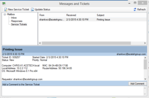 From the Messaging and Tickets window you can see Service Tickets, check their status and even add comments. Be sure to click Refresh and/or Update Status to see the latest information about your tickets.